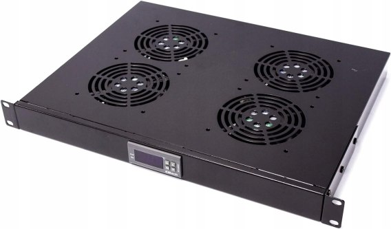 Jednostka wentylacyjna do szafy rack 19 ". To akcesorium o wysokości 1U, które jest zainstalowane w szafie rack 19". Ma wentylatory, które cyrkulują powietrze od dołu (zimniej) do góry (cieplej). Tworzy to wymuszony strumień powietrza w szafie stelażowej, ułatwiając odprowadzanie ciepła z komponentów elektrycznych. Model zawierający cyfrową kontrolę czasu i temperatury. Wykonany z czarnego metalu.