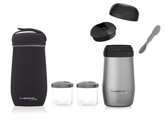 W zestawie ze składaną łyżeczką, mocowaną do pokrywki.