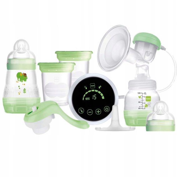Praktyczny zakres dostawy - MAM 2 w 1 laktator elektryczny, pompka wraz z 2 butelkami Anti-Colic MAM Easy Start (130 ml i 160 ml) i 2 x kubek MAM do przechowywania mleka matki, zielony,