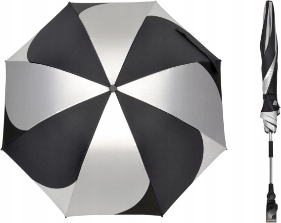 Stabilny: łatwe mocowanie zaciskowe (śruba). Parasol można łatwo i szybko przymocować do wózka, spacerówki lub joggera i można go indywidualnie regulować dzięki zintegrowanemu elementowi zginającemu.
