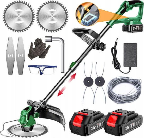 • Bezprzewodowa podkaszarka do trawy 3 w 1- Bezprzewodowa podkaszarka do trawy jest wyposażona w 3 rodzaje głowic tnących: plastikowa szpula nadaje się do koszenia miękkiej trawy, metalowe ostrza ze stali nierdzewnej nadają się do koszenia trawników, chwastów i małych krzewów, Piły tarczowe wykonane ze stali manganowej nadają się do przycinania grubszych gałęzi krzewów. Ostrze jest ostre i mocne, można szybko ciąć. Więcej akcesoriów w jednym, aby spełnić wszystkie Twoje potrzeby.