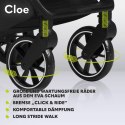 - Składany wózek podróżny CLEO jest wyposażony w duże, niewymagające konserwacji kółka z wytrzymałej pianki EVA, które idealnie nadają się do różnych powierzchni. Przednie koła można obracać o 360°, co umożliwia efektywne manewrowanie w zatłoczonych miejscach. Amortyzacja z przodu i z tyłu zapewnia stabilność i chroni dziecko przed uderzeniami i wstrząsami