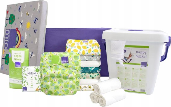 Zestaw zawiera 8 pieluszek miosolo (różne wzory), 3 pieluszki mioboost, 100 szt. super miękkich wkładów separacyjnych mioliners, 300 g środka dezynfekującego miofresh, 1 wiaderko z pokrywką i uchwytem, 2 siatki na pieluchy